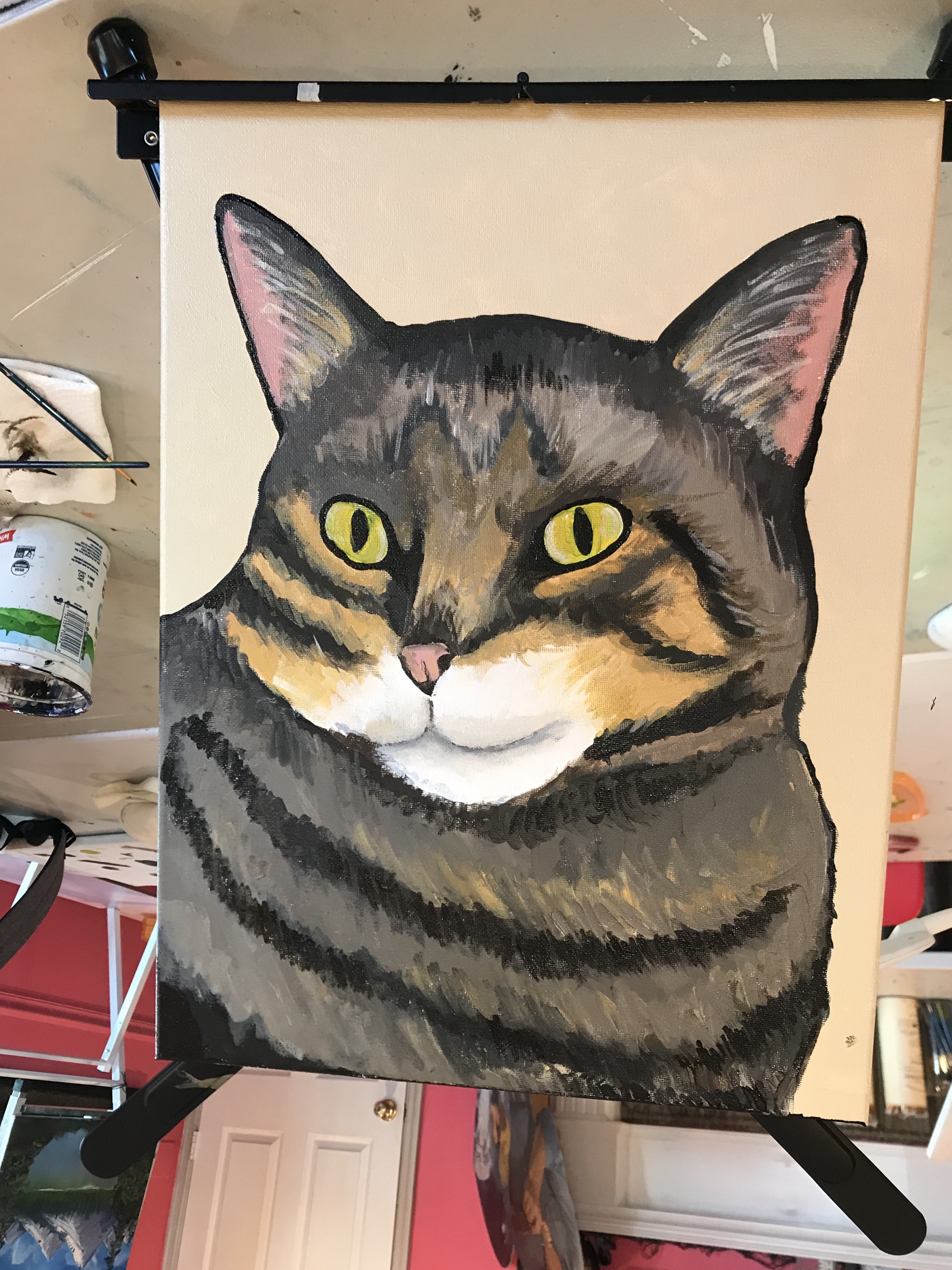 This morning we took a painting class together. We each painted a portrait of our cats, Dot and Cat. I chose Dot, and Amanda painted Cat. You can see the results below. I think I’ll hold on to my day job, as an artist I will never be.